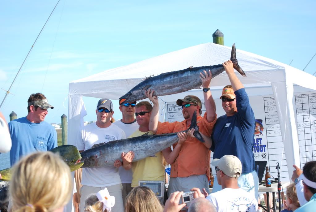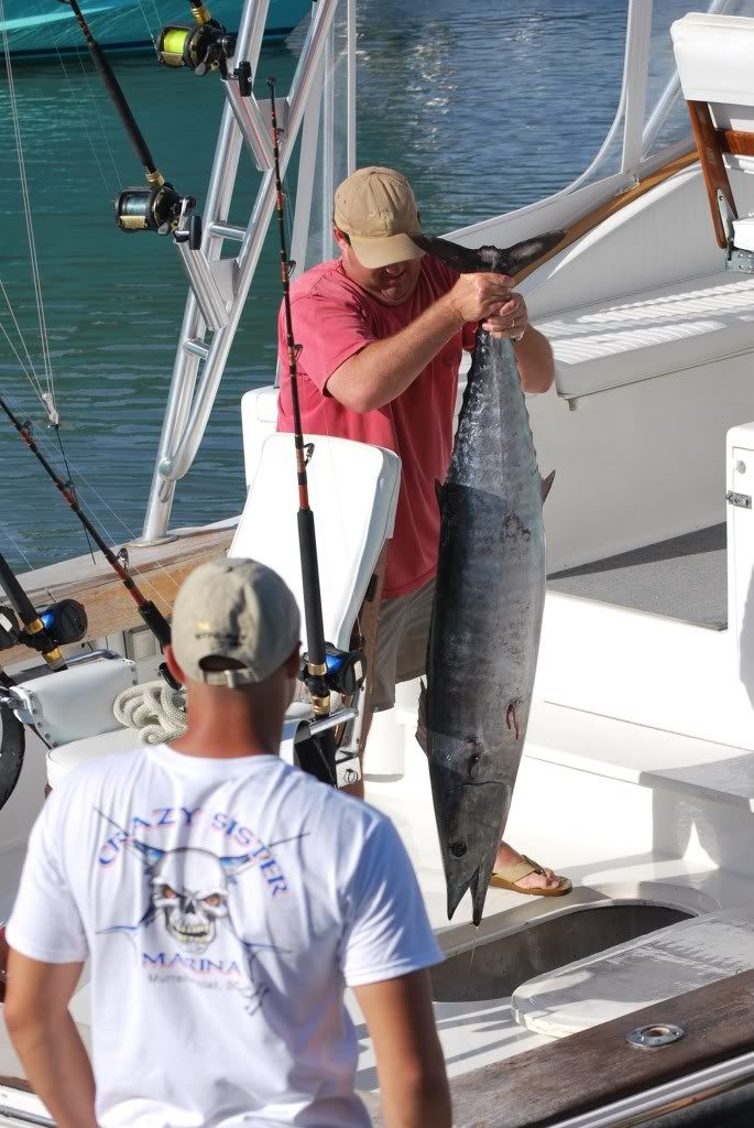 we left the dock at 430 and headed for the scarp. Cleared the jetties around 445. the ocean was nice until we got close to the rain. Had a peanut on right after the first bait was put out. caught 2 wahoo. one 48# and the winning hoo was 57.2#. also caught a 26.3# dolphin around the 900 hundred line. Slicked off on the way home. won the aggregate with a gross weight of 83.5#.