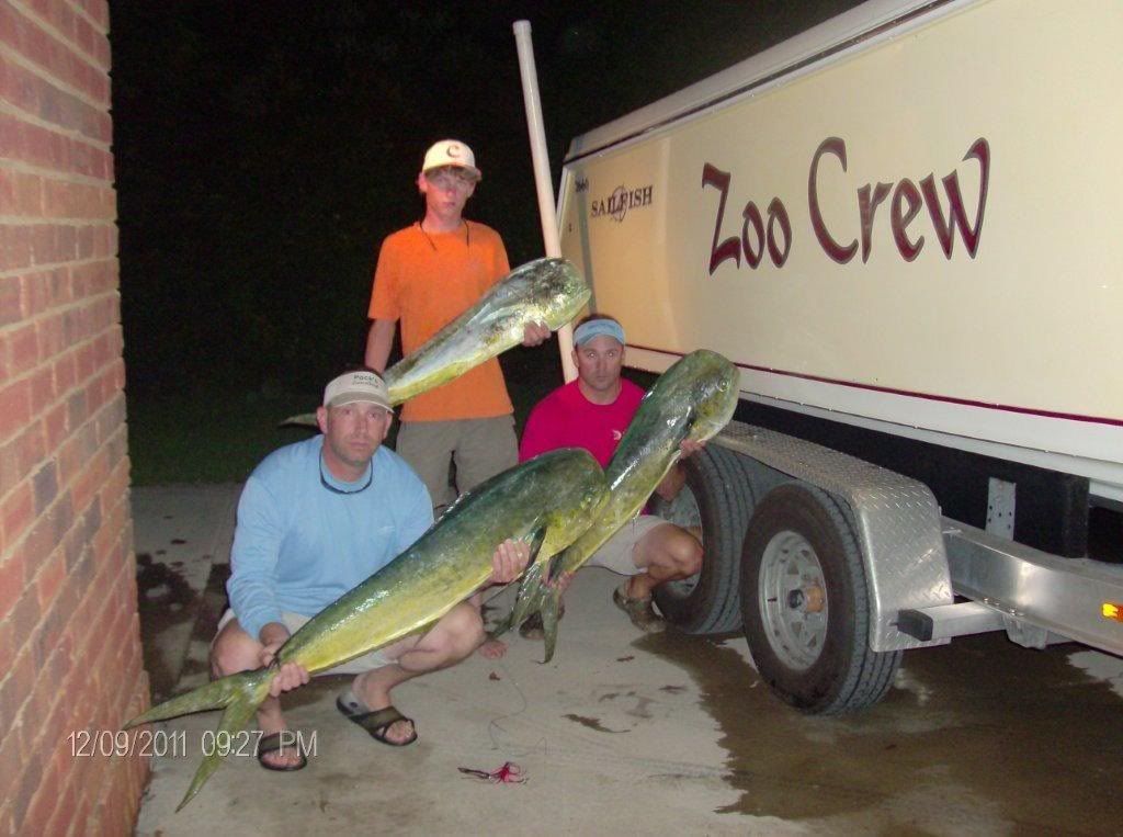 Headed straight out to the hole on a decent ocean at 25mph and later bumped it up to 35mph. The crew consisted of Zoo Crew, Frontier (formerly verizon), AC and Killer. Unfortunately the Key Stone Cop had an engagement he could not get out of and would later regret. Started trolling in 200ft of water on an ocean that resembled Lake Marion at the crack of dawn, dead slick. After trolling for a while and finding few fliers, no grass and no life at all we pushed on further offshore and found a small weedline. We ran into a pile of slingers and decided to throw the yamahas and in neutral. In roughly one hour we caught somewhere in the neighborhood of around forty slingers all on bass rods and spinning reels. We were in roughly 80 degree water that was around 550ft deep. After releasing twenty or so we grew tired and left in search of larger mahi. We found them around 2pm (in Chunky Dunks’s secret hole, don’t tell him)in 250ft of water on scattered grass and caught three in the 25lbs range and lost another two or three the same size. We ran back in around 32mph on decent ocean with a north to north east wind (weather man wrong).
