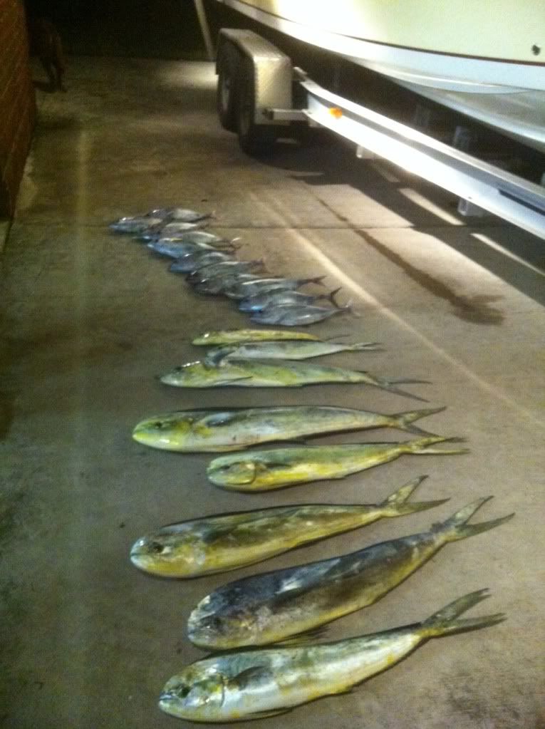 Made the call Thursday and lined up Brick, Keystone Cop, Cat Doc and his son. Well after making the call to push through the jetties which were absolutely terrible at Georgetown we settled in for a slow ride out at 19mph. Finally got the baits in around 0830 and nothing for the first 15 minutes and then all of sudden four rods go down and we put 4 blackfin in the boat. Regrouped and got set up again and shorlty later 5 rods go down and we pick up 4 more blackfin. We caught most fish in 200ft of water and ended the day with 11 blackfin and 9 dolphin. The ocean settled down and we cruised back in at 29mph. We had a great day and unmatched fellowship.